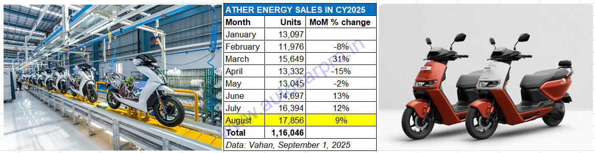 Bengaluru-based smart electric scooter startup Ather Energy, which is having a stellar run in domestic market, has clocked record monthly retail sales of 17,856 units in August 2025 as per Vahan. This is a 62% YoY increase (August 2024: 11,046 units) and makes last month the company’s best ever since it entered the e-2W market in end-CY2018.