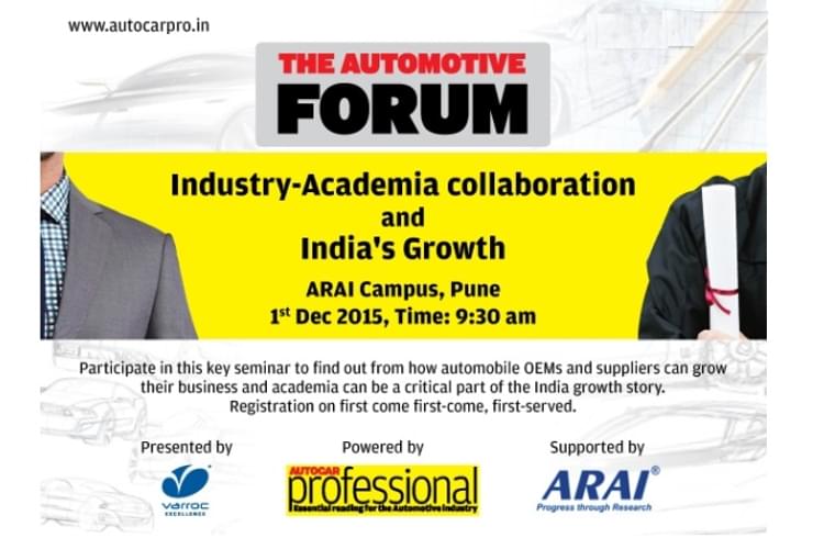 A key seminar for auto industry professionals and academia representatives. Participate to find out from how automobile OEMs and suppliers can grow their business and academia can be a critical part of the India growth story. Registration on first come first serve basis.