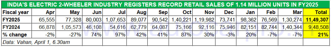 Electric two-wheeler OEMs have sold over 1.14 million units in FY2025, up 21% on FY2024's 948,508 units and surpassed the million milestone for the first time.