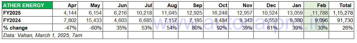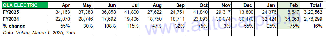 Ola Electric may be down for the month but its cumulative 11-month sales of 320,562 units, up 16%, give it an overall industry leadership status for FY2025, with March sales yet to be factored.