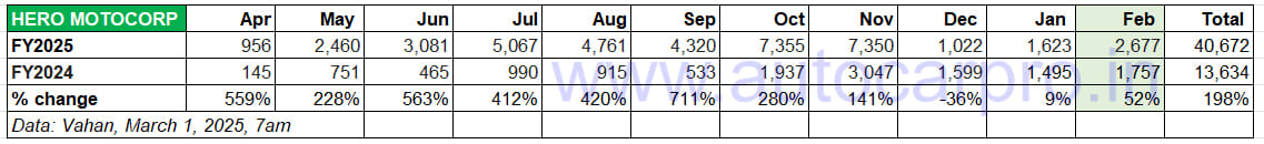 Hero MotoCorp’s February 2025’s retails at 2,677 Vida 1 and 2 e-scooters make for 52% YoY sales growth (February 2024: 1,757 units).