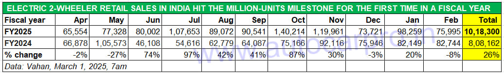 At 10,18,300 units retailed between April 2024 and February 2025, India e2W Inc has sold over a million units for the first time in a fiscal year, with March 2025 sales yet to be counted.