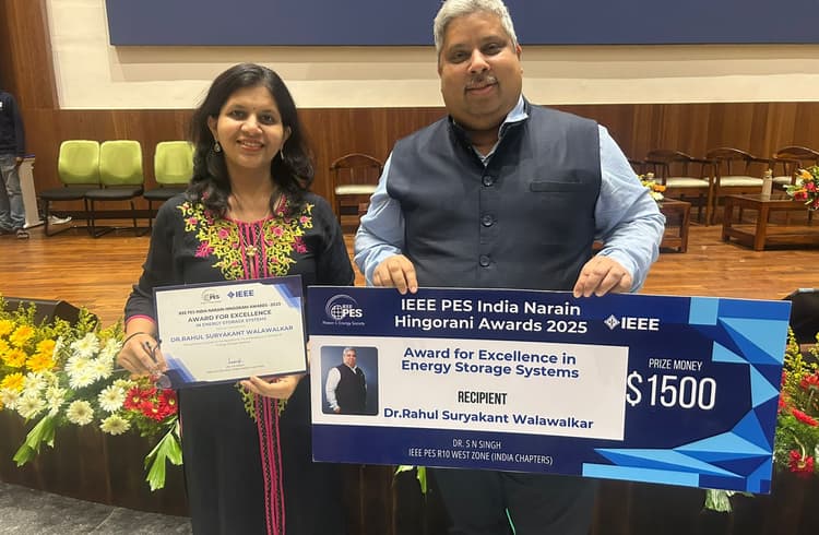 Dr. Rahul Walawalkar, President of the NetZero Energy Transition Association (NETRA), has received the IEEE Power & Energy Society's Hingorani Award for his contributions to energy storage solutions. The award was presented at the 11th International Conference on Power Systems at IIT Hyderabad, with Samir Chandra Saxena, Chairman and Managing Director of Grid Controller of India Limited, among the attendees.