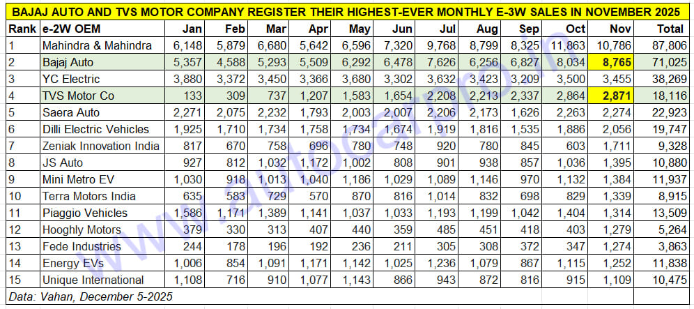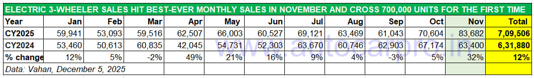 Deliveries of e-3Ws crossed the 80,000 mark for the first time in November 2025 and enabled total sales to surpass the 700,000 milestone for the first time.