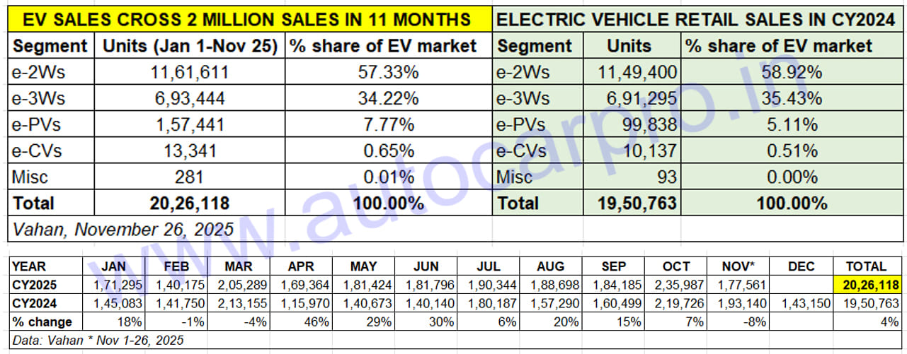 EV sales charge past 2 million sales in first 11 months of CY2025, all 4 segments hit a new high as the 2- and 3-wheeler as well as passenger and commercial vehicle segments already surpassed their CY2024 sales.