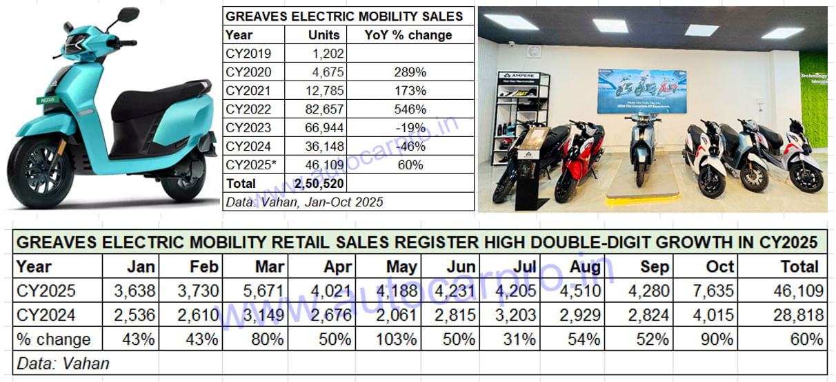 GEM completed its acquisition of the Coimbatore-based EV start-up Ampere Vehicles in November 2019. Retail sales data, sourced from the Vahan portal and encompassing e-2W deliveries of both Greaves Electric Mobility and Ampere Vehicles, puts the figure at 250,520 units at the end of October 2025 (see data table below).