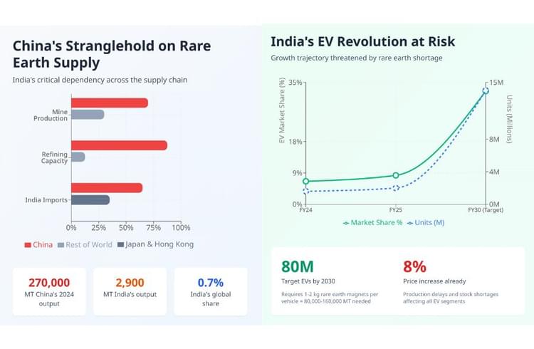 The rare earth shortage, intensified by Chinese export restrictions and supply chain bottlenecks, began impacting the Indian automobile sector by early 2025, affecting manufacturers across all EV segments. China's tightening of export rules, including new licensing mandates introduced in 2024, has severely constrained global supply and raised serious concerns over supply security. For Indian EV manufacturers, this has led to: