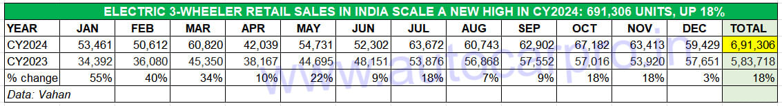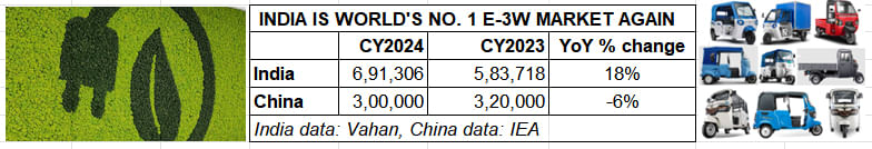 While demand for electric 3Ws continued to slow down in China, India registered record retail sales of 691,306 units in CY2024 to maintain its No. 1 position for the second straight year.