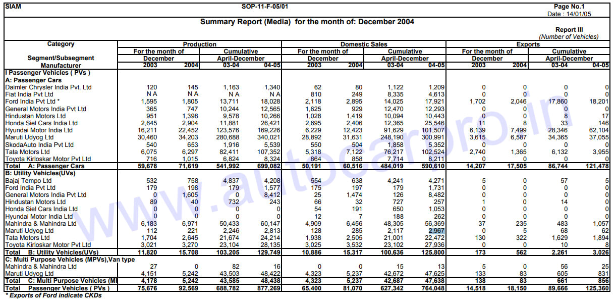 In April-December 2004, Maruti accounted for 300,991 units or 51% of the total 590,610 passenger car wholesales. If UV sales are clubbed with car sales, Maruti’s share drops to 46% – 351,583 units (300,991 cars, 2,967 UVs and 47,625 vans). Interestingly, as the 20-year-old stats reveal, Tata Motors with sale of 102,524 cars (Indica and Indigo) was the No. 2 car OEM with a 27% market share, followed by Hyundai Motor India (101,507 units of the Santro Xing, Getz, Accent, Elantra and Sonata / 17% market share).