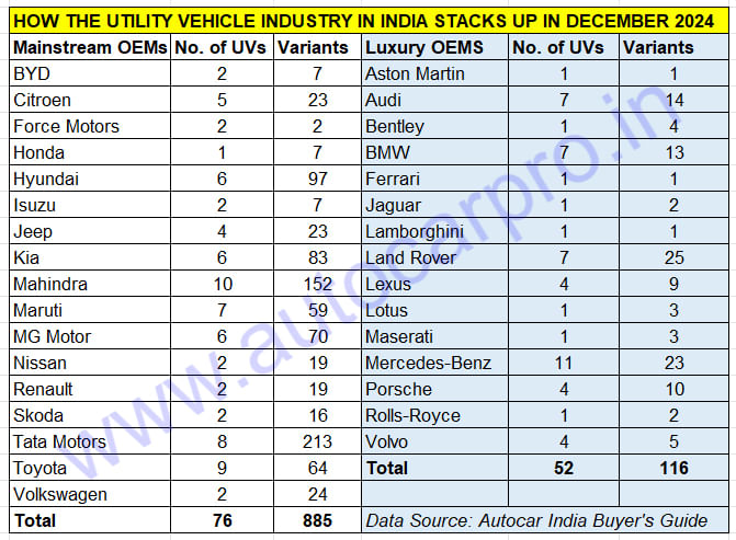 In December 2004, there were 17 vehicle manufacturers in India, 11 of which had UVs on offer. December 2024 has 34 UV OEMs with 128 UV models and 1,001 variants.
