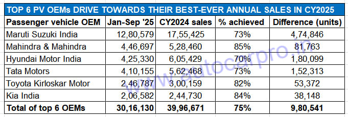Mahindra, Toyota and Kia, which have already achieved over 80% of their CY2024 wholesales, will be the earliest of the Top 6 PV makers to register their best-ever annual sales in CY2025.