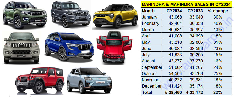 Mahindra & Mahindra has sold over half-a-million SUVs for the first time in a calendar year. With the company announcing its December 2024 wholesales numbers today, annual sales for CY2024 add up to 528,460 units, which constitutes a robust year-on-year increase of 22% (CY2023: 433,172 units).