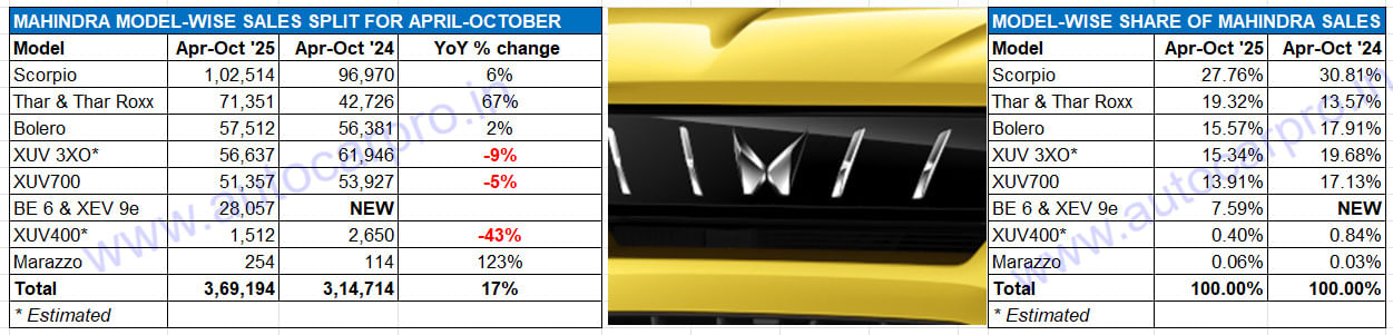 The XUV 3XO compact SUV, with 56,637 units (down 9% YoY)), is ranked model No. 4 for the company with a share of 15% versus nearly 20% a year ago.