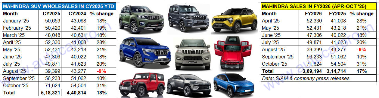 M&M has received a growth accelerator in the form the two new zero-emission SUV launched early this year. While the BE 6 and XEV 9e’s 10-month calendar-year sales of 36,104 units in India translate into a 7% share of the 518,321 M&M SUVs sold, their share of the first seven months of FY2026 improves to 8% of the 369,194 SUVs M&M has dispatched to its showrooms across the country. In October, these two Born Electric SUVs clocked best-ever monthly sales of 4,842 units and contributed 7% to M&M’s record SUV sales of 71,624 units last month.