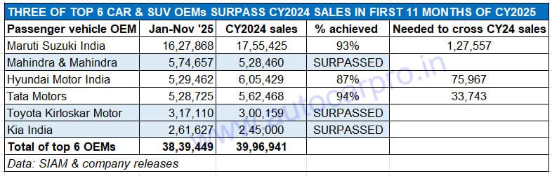 While Mahindra, Toyota and Kia have already registered record annual sales in the first 11 months of CY2025 itself, Maruti Suzuki, Hyundai and Tata Motors still need their December sales to reach there.