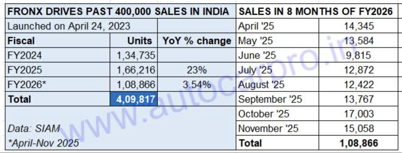 With 108,866 units sold in the first eight months of FY2026, the Fronx is well set to surpass its FY2025 total and achieve over 175,000 wholesales in the current fiscal.