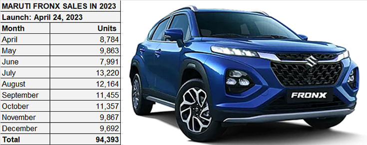 Between April and December 2023, the Fronx averaged monthly wholesales of 10,488 units. It has surpassed 100,000 sales in the fourth week of January.