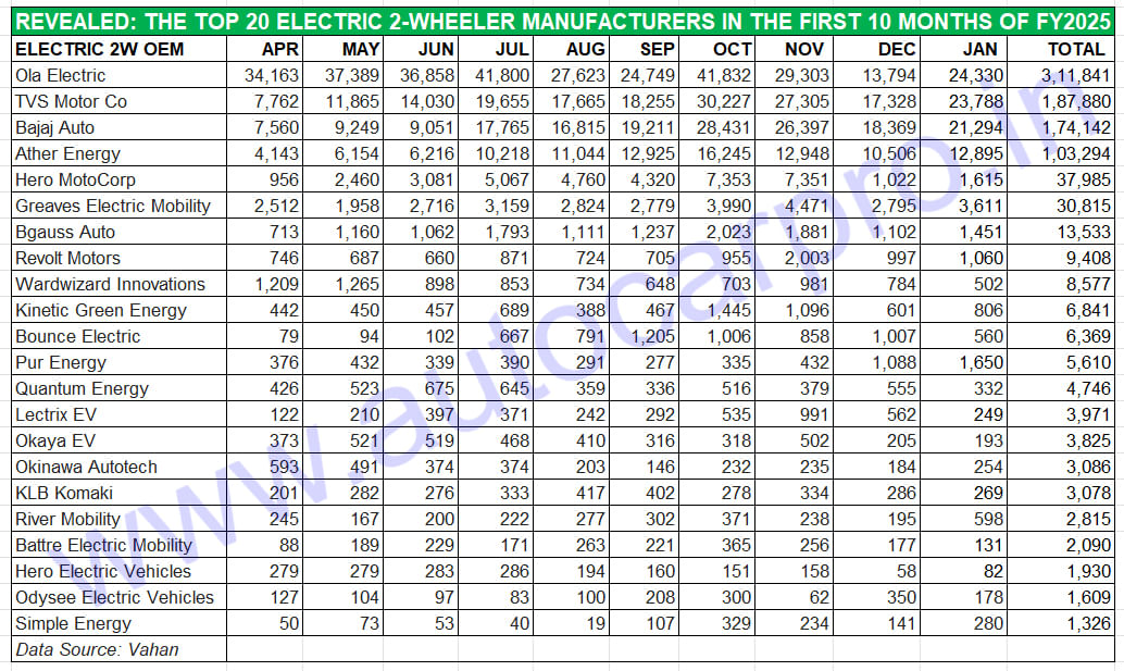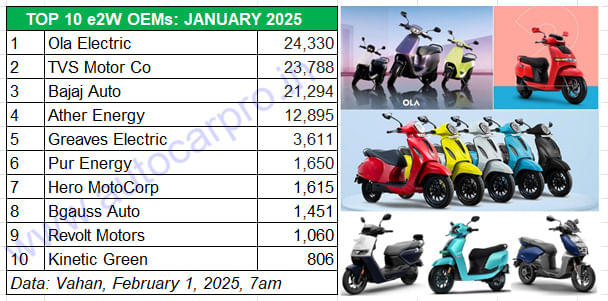 January 2025 saw a strong contest between Ola and TVS. Of the 97,677 e2Ws sold in January, Ola, TVS, Bajaj Auto and Ather Energy command an 84% share.