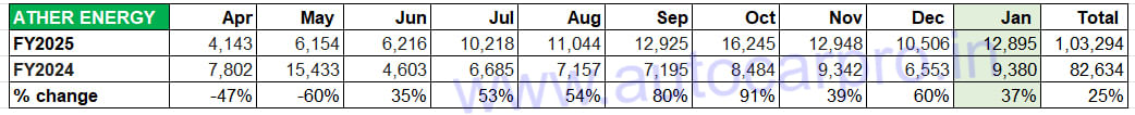 In January, Ather sold 12,895 units, up 37% YoY (January 2024: 9,380 units). Its cumulative 10-month retails at 103,294 units are up 25% YoY and give the company a market share of 11 percent. The Rizta family e-scooter launched in April 2024 at a starting price of Rs 109,999 (Rizta S) through to Rs 149,999 (Rizta Z) is witnessing growing customer acceptance. While the S version (2.9 kWh battery) has a 123km range, the Z variant (3.7 kWh) has a 160km range. The Rizta’s highlights include the largest two-wheeler seat in India and storage space aplenty. The Ather Rizta recently bagged Autocar India’s Electric Two-Wheeler of the Year 2025 award.