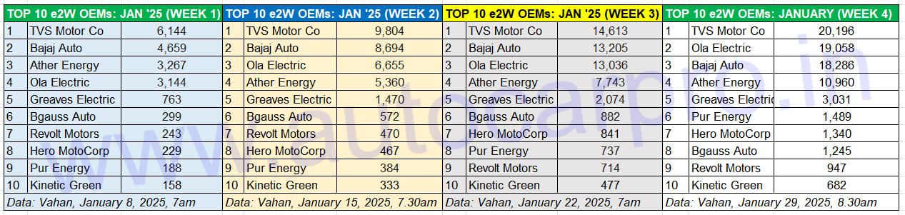 Ola Electric was ranked No. 4 in January’s Week 1, No. 3 in Weeks 2 and 3, and No. 2 in Week 4. A late charge in the last 3 days, when it sold an additional 3,598 units, gave it the No. 1 position for the month.
