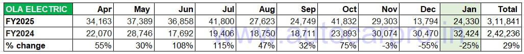 Ola Electric may have regained its No. 1 title for the month but its January retails of 24,330 units are down 25% YoY (January 2024: 32,424 units). Its cumulative 10-month sales of 311,841 units are up 29% YoY but it does not look like Ola will manage to surpass its record CY2024 sales of 407,547 units in the 12 months of FY2025. That’s because quarter on quarter, its numbers have dropped. Compared to Q1 FY2025’s (April-July 2024) 108,410 units, Q2 sales were lower at 94,172 units and Q3 even lower at 84,929 units, dragged down by December’s 13,794 units, down 55% YoY.