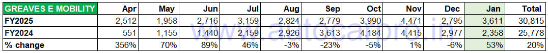 Greaves Electric Mobility (GEM), which currently has a six-model portfolio of e-scooters comprising the Nexus (pictured above), Primus, Magnus LT/EX (100km+ range), Ampere Magnus Special, entry level Rio Li/La Plus and Zeal EX, sold 3,611 units in January 2025 (up 53% YoY). This performance gives it a market share of 3.69% for the month and fifth rank after Ather. GEM’s cumulative 10-month retails at 30,815 units are up 20% YoY and give it a 3.27% market share.