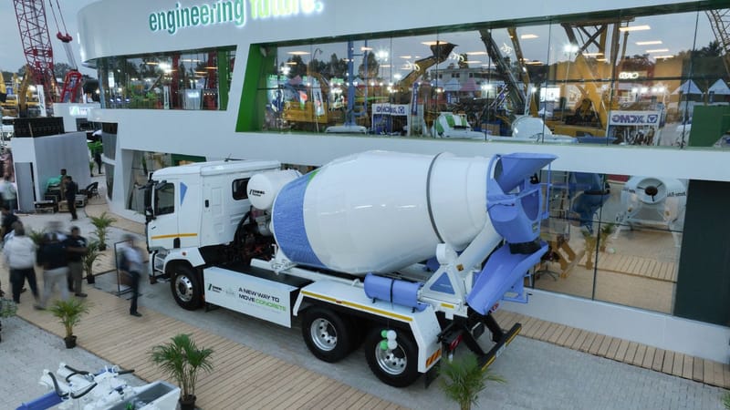 Collaboration delivers 7m³ battery-powered mixer with fast-charging capability at Bengaluru construction equipment expo.