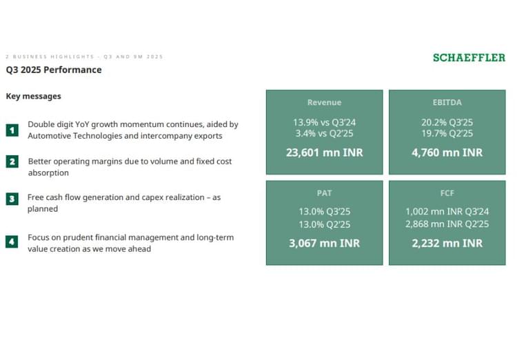 Schaeffler India's performance was supported by double-digit growth in its Automotive Technologies division, which grew 28.8% year-on-year in Q3. The company secured new business wins across segments, including hydraulic tensioners in passenger vehicles, HD clutches in commercial vehicles, and continued momentum in dampers and light vehicle clutches.