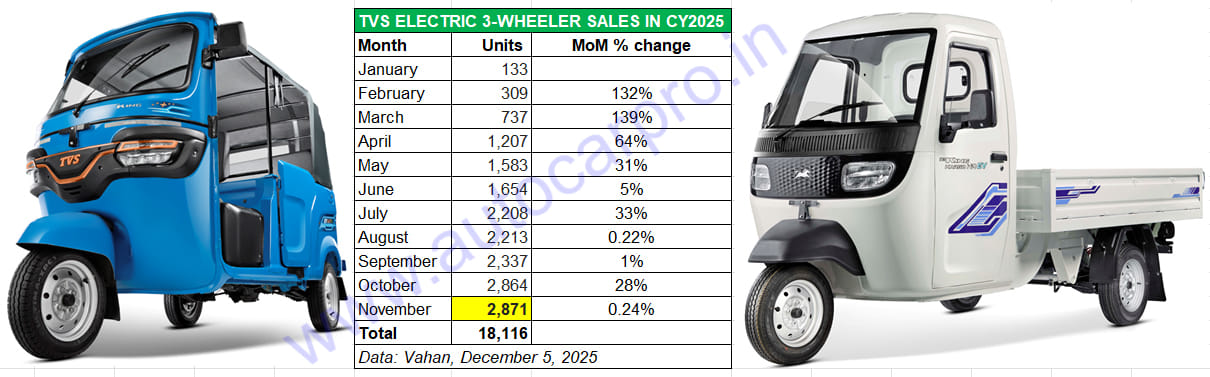 TVS Motor Company, the latest legacy ICE three-wheeler OEM to enter the electric three-wheeler market in India, has registered its highest monthly sales of 2,871 units in November 2025. As per the latest retail sales data on the Vahan portal, the company has delivered a total of 18,116 units between January and November 2025, with sales increasing month on month.