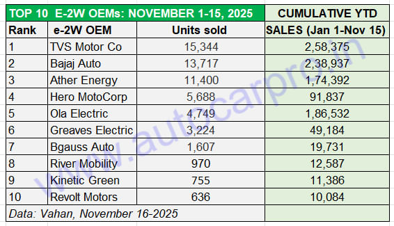 The big news of the first fortnight of November though is Hero MotoCorp’s Vida brand moving into No. 4 position, ahead of Ola Electric. As per Vahan, the company has delivered a total of 5,688 Vida e-scooters in the past 15 days, 939 units more than Ola Electric (4,749 units), which give it a 9% market share – 1% more than Ola. The world’s largest two-wheeler manufacturer continues to be an EV newsmaker as a result of the robust demand for its new Vida VX2 model. October 2025 (15,994 units) was its highest monthly sales and marked four straight months of 10,000-plus units.