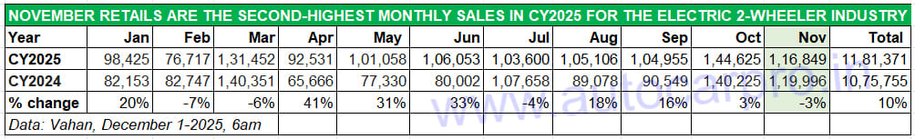 November 2025 retail sales of 116,849 e-2Ws are the second highest monthly sales in the year to date.