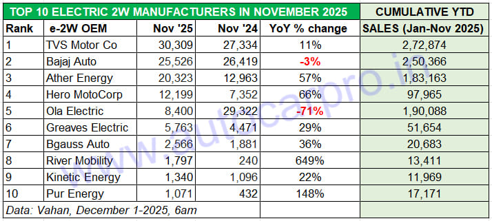 Ola Electric, with retail sales of 8,400 units in November, down sharply by 71% YoY (November 2024: 29,322 units), slips to No. 5 in the e-2W OEM market and gives it a market share of 7% for last month. As per Vahan statistics, this is the lowest monthly retail sales for Ola in the current year to date after February 2025 (8,673 units).