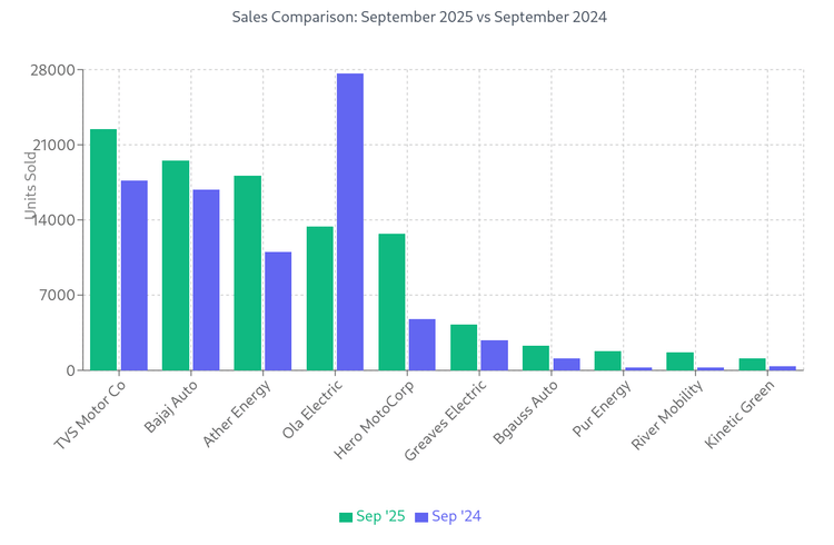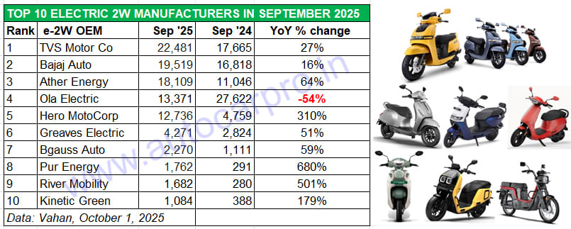 TVS tops e-2W sales for six months running, Bajaj Auto regains No. 2 rank in September