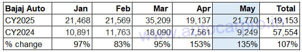 For the January-May 2025 period, Bajaj Auto has sold a total of 119,153 Chetaks, up 107% YoY (January-May 2024: 57,554 units). This is 928 units more than TVS’ five-month sales on account on being ahead in two months of this year to date.