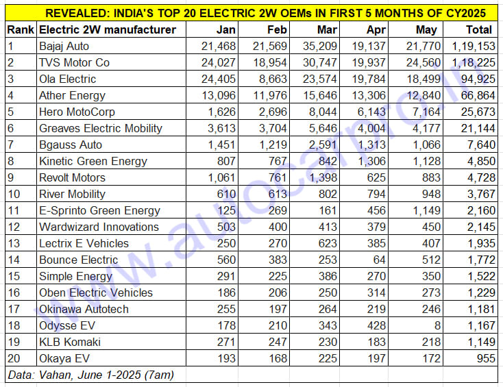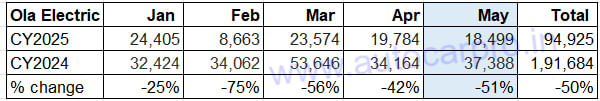 Ola Electric sold a total of 18,499 electric scooters and motorcycles in May 2025, down 51% YoY (May 2025: 37,388 units). The company had last topped the monthly sales chart in January 2025 but lost that spot to Bajaj Auto in February and March 2025, and to TVS in April and May 2025.
