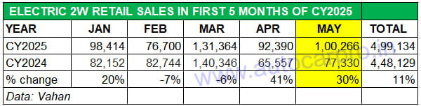 As per the latest retail sales statistics on the Vahan portal (June 1, 7am), cumulative e-2W sales for the first five months of this year at 499,134 units are up 11% YoY (January-May 2024: 448,129 units). This is 43% of CY2024’s record e-2W sales of 1.14 million units (11,49,374 units), and creates a firm foundation for India e-2W Inc to build on for the remaining seven months of CY2025.