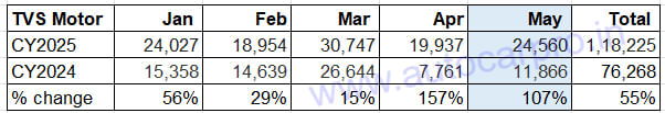 This performance gives TVS and the iQube a monthly market-leading share of 24 percent, considerably improving upon its May 2024 share of 15 percent. Cumulative sales of the iQube for the first five months of CY2025 at 118,225 units are up 55% YoY (January-May 2024: 76,268 units)