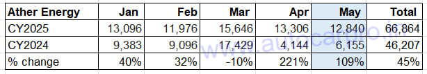 In April 2025, the Rizta (10,052 units) accounted for 73% of the company’s total wholesales of 10,773 units. Expect the Rizta to have sold over 10,000 units in May 2025, which would take its cumulative sales since launch to over 110,000 units. In FY2025, the share of the Rizta (89,639 units) in Ather’s 12-month sales of 155,405 e-scooters was 58 percent.
