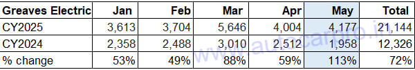 Greaves Electric Mobility (GEM), the EV arm of Greaves Cotton, has clocked retail sales of 4,177 e-scooters in May 2025, as per Vahan data. This sees the company maintain the same market share it had a year ago: 4 percent.