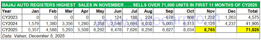CY2025 has turned out to be a record year for Bajaj e-3Ws. Cumulative sales in the first 11 months of this year at 71,025 units are up 88% year on year (January-November 2024: 37,668 units). This gives the company a 10% market share of the 709,506 e-3Ws sold across the country. With December numbers still to be factored, as also the market entry of the Riki e-rickshaw, in both passenger and cargo variants, expect Bajaj Auto to clock total sales of around 82,000-85,000 units in CY2025.