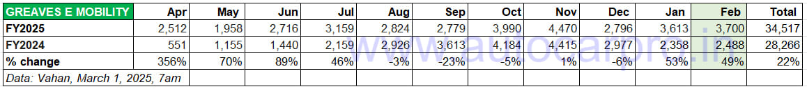 Greaves Electric Mobility (GEM), the EV arm of Greaves Cotton, sold 3,700 units in February 2025, up 49% YoY. The company, which has a six-model portfolio of e-scooters comprising the Nexus (pictured above), Primus, Magnus LT/EX (100km+ range), Ampere Magnus Special, entry level Rio Li/La Plus and Zeal EX, has cumulative 11-month retails of 34,517 units. This is a 22% YoY increase and give it a 3% market share.