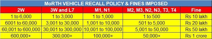 While SIAM's voluntary recall code has paved the way to a structured vehicle recall exercise in India, the operation got another charge in April 2021. The Ministry of Road Transport & Highways (MoRTH) has, effective from April 1, 2021, mandated stiff fines, which go up to Rs 1 crore, on vehicle manufacturers (detailed below).