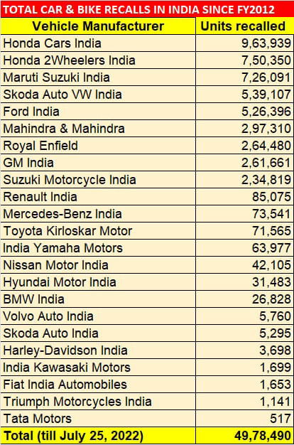 SIAM’s exhaustive data on the subject of voluntary vehicle recalls makes for good number-crunching. Of the total 23 OEMs listed, 16 are PV manufacturers and seven are two-wheeler makers. While two – GM and Ford – have completely exited India, Harley-Davidson has handed over retail operations to Hero MotoCorp. Of the total 49,78,490 units recalled, 36,58,326 units or 73.48% constitute PVs and the balance 13,20,164 units or 26.51% are two-wheelers. Both the Hondas – Honda Cars India (9634,939 units) and Honda Motorcycle & Scooter India (750,350 units) top the respective segments.