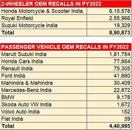 Three 2-wheeler and 10 PV OEMs in FY2022's recalls