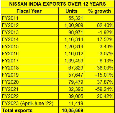 As per Autocar Professional’s data analytics, the journey from 700,000 to 1,000,000 export units has taken all of five years. Between FY2018 through to April-June 2022 (Q1 FY2023), a total of 287,769 units were exported. From consistent six-figure numbers from FY2014 through to FY2017, Nissan Motor India’s exports have seen a sharp decline – FY2018’s 67,829 units were down 38% on FY2017’s 109,459 units.