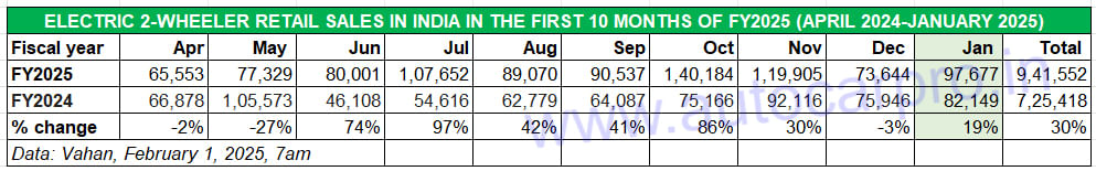 At 945,112 units retailed between April 2024 and January 2025, India e2W Inc is just 3,389 units away from surpassing FY2024’s record sales of 948,501 units.