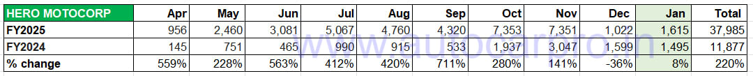 Hero MotoCorp’s January 2025’s retails at 1,615 Vida e-scooters make for 8% YoY sales growth (January 2024: 1,495 units) and they come on the back of a poor performance in December (1,022 units, down 36%). October (7,353 units) and November (7,351 units) have been the best months for Vida EV retails in the fiscal year to date.