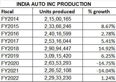 As per SIAM’s production data for the past nine fiscals, India Auto Inc saw a high of 30.91 million units in FY2019 (see data table above). Since then, output has substantially declined due to the slowdown which began in FY2020 and was exacerbated by the Covid-19 pandemic after April 2020. Overall industry output rose in FY2022 after two straight years of decline, with FY2023.