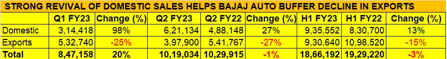 Bajaj Auto’s two-wheeler sales have registered a strong domestic market performance in the second quarter of FY2023. Q2 numbers at 621,134 units were nearly double (97%) that of Q1 FY2023: 314,428 units. Cumulative sales for the first-half of FY2023 (April-September 2022) are 935,552 units, up 13% year on year.