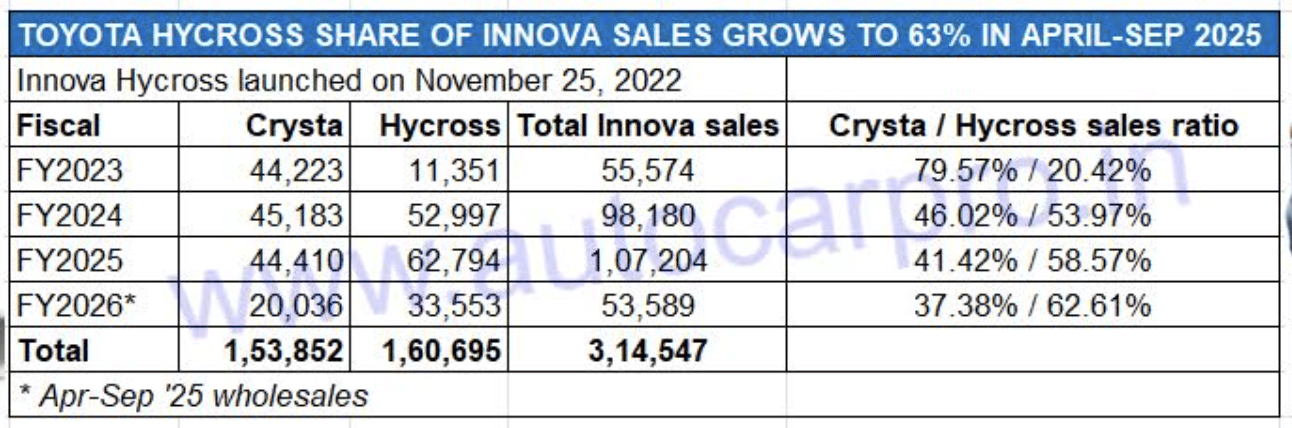 Of the 53,589 Innova MPVs sold in the April-September 2025 period, the Hycross accounted for 33,553 units or 63% of total sales versus the Crysta’s 20,036 units and a 37% share.